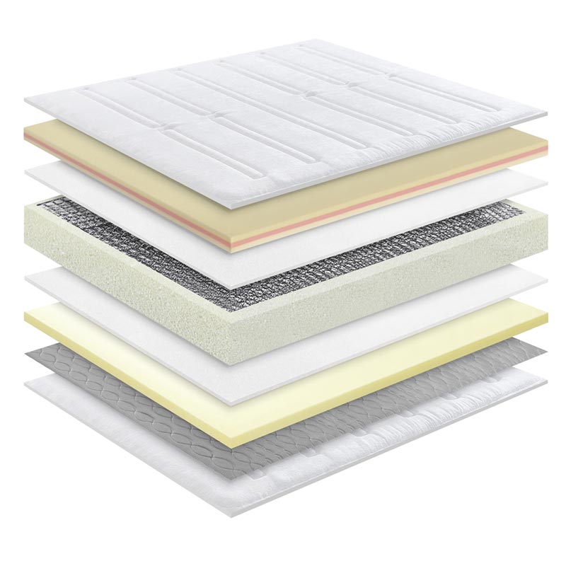 ชั้นความสบายด้านบนใช้เมมโมรีโฟมความยืดหยุ่นสูงที่ตอบสนองต่ออุณหภูมิและน้ำหนักของร่างกาย